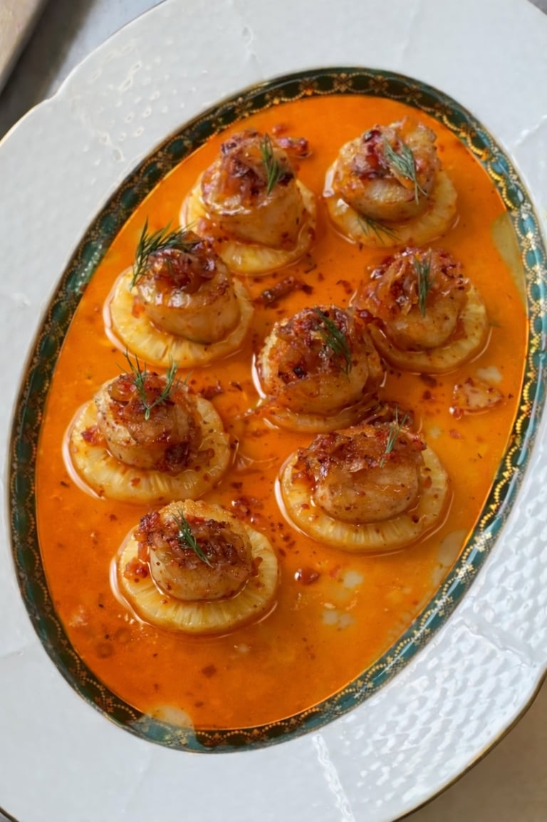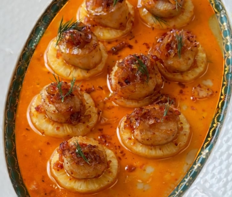 Scallops poached in spicy tomato butter with pineapple carpaccio