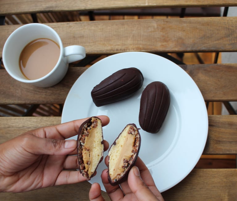 Mysore madeliene entremet with ghee, jaggery & milk chocolate