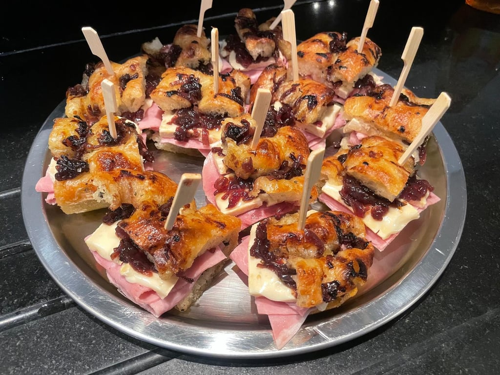 Focaccia sandwich with truffle pâté, ham, taleggio, caramelized onions