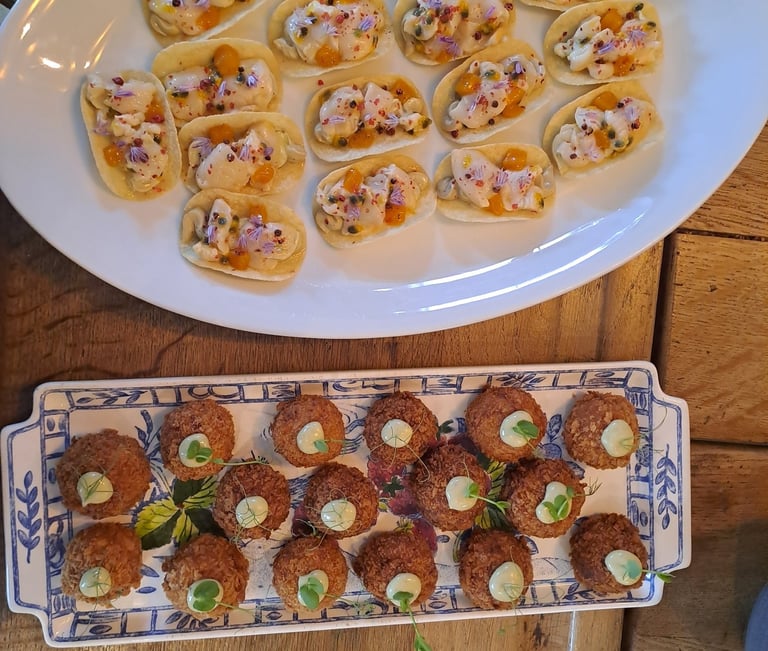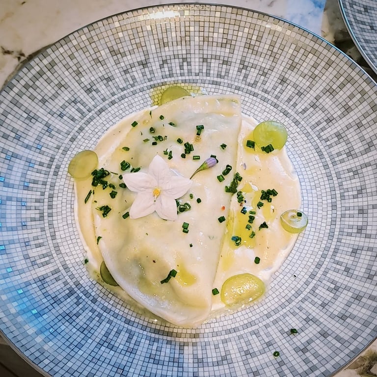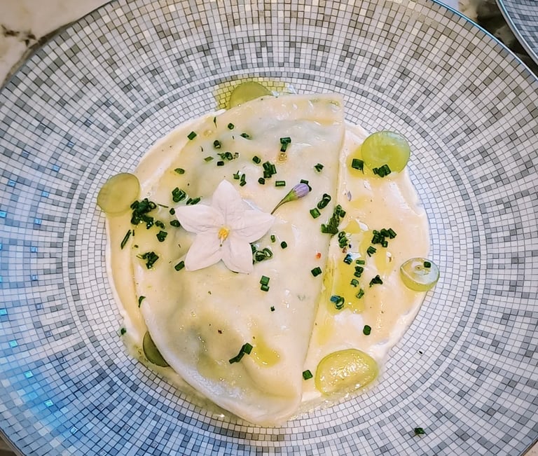 Lobster raviolis, baccala sauce, grapes, chives & lemon oil