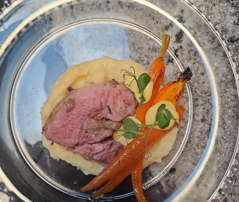 Lamb à la salees, saffron sauce, potato purée & roasted carrots