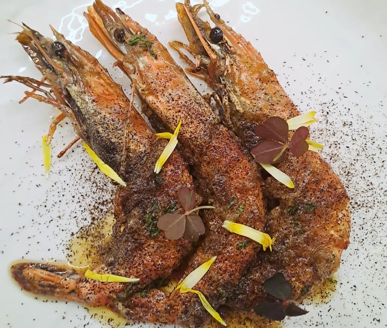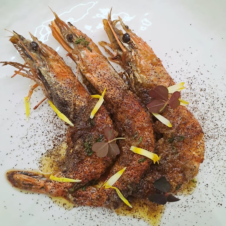 Grilled giant shrimps with black lime and smoked garlic butter