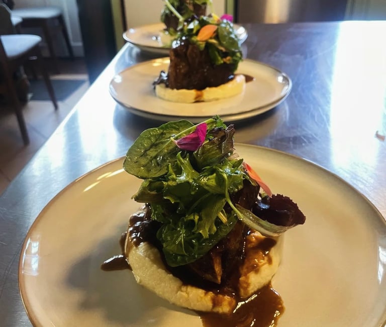 Beef cheeks in bourguignon sauce, celeriac cream & seasonal salad
