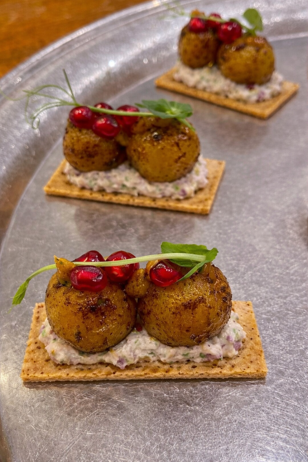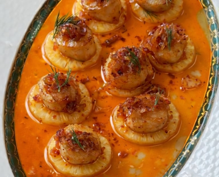 Coquilles st. jacques pochées au beurre de tomates épicé et carpaccio d’ananas