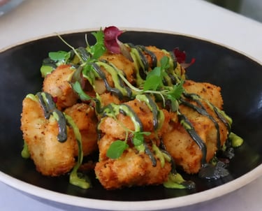 Calamars frits, vinaigre de mangue verte et aïoli au poivre vert