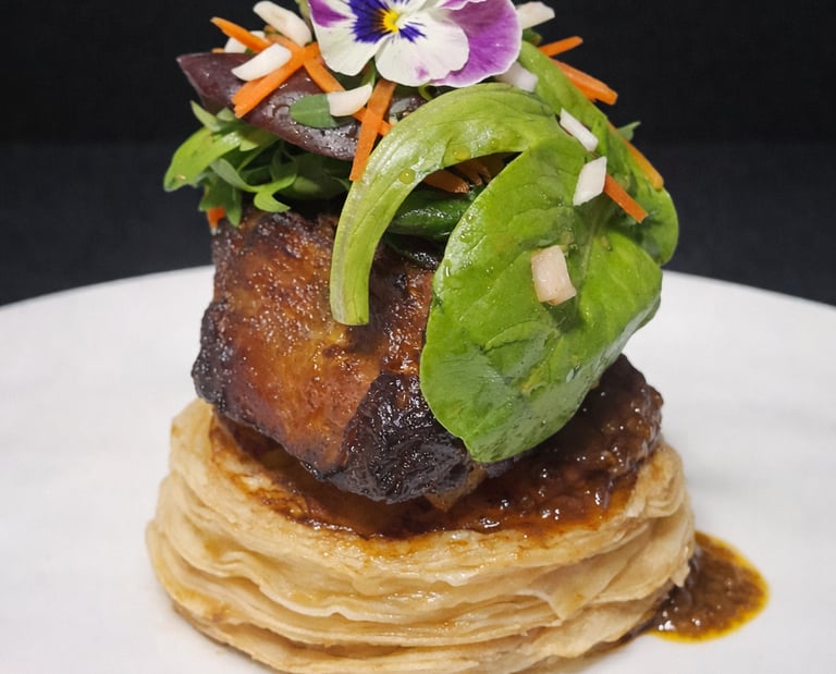 Plat de Côtes de bœuf mijotés à la kéralaise, parotta feuilletée et salade de carottes